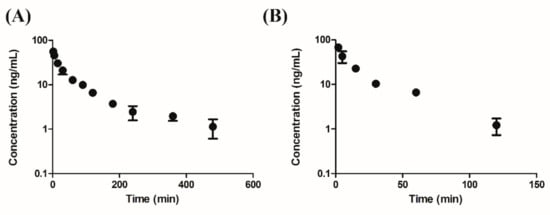 To determine whether the current assay could be applied to pharmacokinetic studies on SH-1242 in preclinical animal species, SH-1242 was intravenously administered to rats or mice at a dose of 0.1 mg/kg. Concentration-time profiles of SH-1242 in rats and mice are shown in Figure 2, and calculated pharmacokinetic parameters, including T1/2, CL, area under the curve from time zero to infinity (AUCinf), mean residence time (MRT), and Vss, are listed in Table 7. For rats, AUCinf, CL, Vss, and T1/2 values of SH-1242 were 3350 ± 573 ng·min/mL, 30.5 ± 4.49 mL/min/kg, 4380 ± 716 mL/kg, and 146 ± 59 min, respectively. Interestingly, SH-1242 appeared to have lower systemic clearance and relatively limited distribution space, compared to those of deguelin, a model rotenoid, in rats (e.g., CL value of 72.7 mL/min/kg, and Vss value of 30.5 L/kg) [20]. In mice, AUCinf, CL, Vss, and T1/2 values of SH-1242 were 1440 ng·min/mL, 69.4 mL/min/kg, 2060 mL/kg, and 26.3 min, respectively. In general, SH-1242 concentrations were readily measurable in all plasma samples in both animals at up to 8 h after the intravenous administration, indicating that the developed method could be readily applicable for the characterization of the pharmacokinetics of SH-1242 in preclinical study settings.