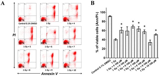 2.5. Pre-Treatment with Compounds 4, 5, 6, 7, 8, and 10 Reduced Radiation-Induced Apoptosis In Vitro