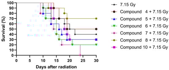 Kaplan–Meier survival curves of irradiated mice pre-treated intraperitoneally (i.p.) with saline buffer (7.15 Gy) and with compounds 4, 5, 6, 7, 8, and 10. Each group (n = 10) was observed until termination of the experiment (30 days after irradiation).
