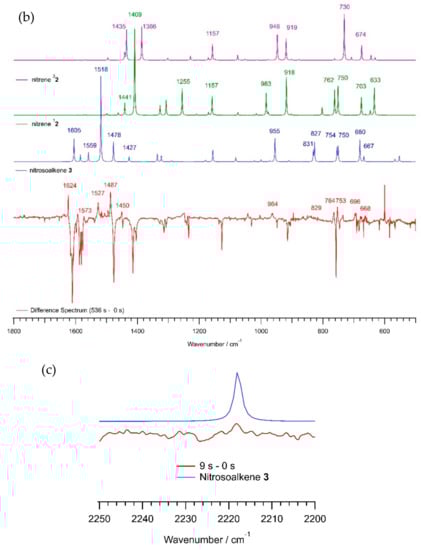 (a) Experimental IR spectra as a function of irradiation time (λ = 254 nm) of azidoisoxazole 1 in an argon matrix; (b) IR spectra of nitrenes 32 and 12 and nitrosoalkene 3 calculated using B3LYP/6-31+G(d) [14] theory and matrix IR difference spectrum (536–0 s); (c) Comparison of matrix IR difference spectrum (536–0 s) with calculated scaled IR spectrum of nitrosoalkene 3.