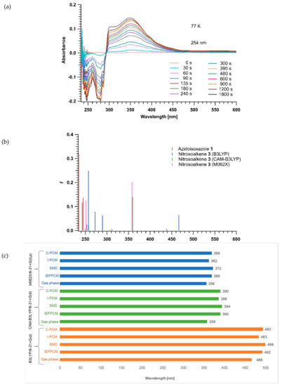 (a) Differential UV-Vis absorption spectra as a function of irradiation time (λ = 254 nm) of azidoisoxazole 1 in glassy 2-methyltetrahydrofuran (mTHF) at 77 K; (b) Calculated time-dependent density function theory (TD-DFT) absorption spectra of nitrosoalkene 3 using B3LYP/6-31+G(d), CAM-B3LYP/6-31+G(d), and M06-2X/6-31+G(d,p) using tetrahydrofuran (THF) as an implicit solvent with C-PCM and I-PCM solvation models; (c) Calculated TD-DFT absorption maxima of nitrosoalkene 3 above 300 nm using B3LYP/6-31+G(d), CAM-B3LYP/6-31+G(d), and M062X/6-31+G(d,p) in the gas phase and using THF as an implicit solvent with C-PCM, I-PCM, SMD, and IEFPCM solvation models.