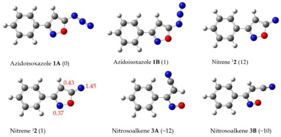 To determine the feasibility of the various pathways displayed in Scheme 4, we calculated the stationary points on the potential energy diagram using DFT calculations (Gaussian 16, B3LYP/6-31+G(d) [14,24,25]). We optimized the structure of azidoisoxazole 1 and obtained two minimal energy conformations, A and B, which differed mainly in the orientation of the azido chromophore (Figure 3). The calculated energies of azidoisoxazole 1A and 1B were within 1 kcal/mol of each other, with A being the more stable conformation. TD-DFT calculations were performed to locate the vertical excitation energies of the first singlet and triplet excited states (S1 and T1) of azidoisoxazole 1. The S1 of 1 and the T1 of 1 were located 86 and 64 kcal/mol, respectively, above the ground state (S0). The open shell triplet and singlet configurations of nitrene 2 were optimized, with the singlet configuration being optimized using a broken symmetry calculation, as achieved using guess=mix as a keyword in Gaussian 16 (Figure 3). Triplet nitrene 2 was 11 kcal/mol more stable than the singlet configuration; however, it should be noted that due to spin contamination, DFT calculations do not accurately estimate the energy gap between singlet and triplet nitrenes. Furthermore, we optimized two minimal conformers of nitrosoalkene, 3A and 3B, with 3A being 2 kcal/more stable than 3B (Figure 3).