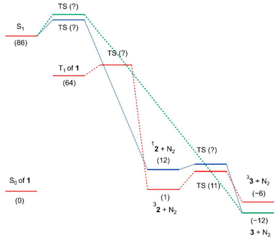 Finally, the photoreactivity of azidoisoxazole 1 was compared with that of isoxazoles in cryogenic matrices. The irradiation of isoxazole derivatives at cryogenic temperatures resulted in the formation of the corresponding ketenimine. It has been theorized that the ketenimines are formed by intersystem crossing from triplet vinylnitrenes that are not stable (Scheme 7) [32,33,34]. Triplet vinylnitrenes can, however, be detected directly by laser flash photolysis of their isoxazole precursors in solution at ambient temperature [32,35]. Furthermore, they can be rendered stable at cryogenic temperatures by incorporating the vinyl bond into a cyclic structure (Scheme 8). The CASPT2 calculated singlet–triplet energy gaps of cyclic vinylnitrenes, reported to be between 10 and 13 kcal/mol, were similar to or slightly smaller than those calculated for nitrene 2 [36,37,38,39]. Thus, azidoisoxazole 1 reacts differently from isoxazole derivatives because it does not undergo cleavage of its C–O bond, as its azido moiety is more reactive.