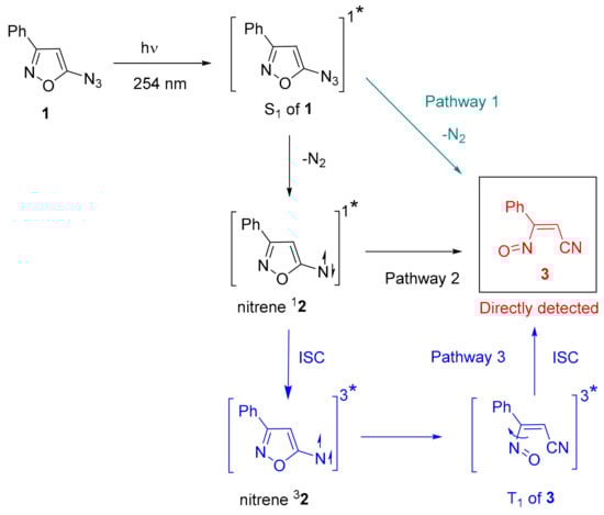Because the energy gap between the S1 and T1 of azidoisoxazole 1 was large (22 kcal/mol), intersystem crossing between these excited states was not expected to be efficient. Thus, it is reasonable that the photoreactivity of azidoisoxazole 1 occurred from its singlet excited state. The calculated energy gap between nitrenes 12 and 32 (13.8 kcal/mol) was slightly less than the singlet–triplet energy gap measured for phenylnitrene (14.9 kcal/mol) [26,27]. At cryogenic temperatures, irradiation of phenyl azide resulted in the formation of triplet phenylnitrene via intersystem crossing from singlet phenylnitrene. Thus, the reactivity of azidoisoxazole 1 at cryogenic temperatures was different from that of phenyl azide, as a stable triplet nitrene was not formed [28,29].