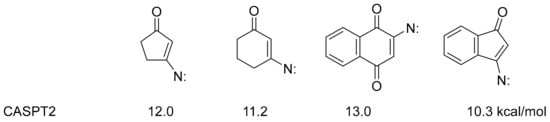 - Gatlin, D.M.; Karney, W.L.; Abe, M.; Ault, B.S.; Gudmundsdottir, A.D. Formation and reactivity of triplet vinylnitrenes as a function of ring size. J. Org. Chem. 2019, 84, 9215–9225. [Google Scholar] [CrossRef] [PubMed]