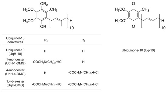 Two types of monoester and a bis-ester were successfully obtained by chemical synthesis (Figure 1) and characterized by MS, elemental analysis, and 1H-13C HMBC NMR. The melting points of the monoesters (UqH-1-DMG, UqH-4-DMG) and the bis-ester (UqH-DMG) were approximately 80 °C and 180 °C, respectively (shown in Section 3.4). The melting points of these esters were much higher than that of Uq-10 (48 °C). UqH-DMG formed a transparent solution in water at concentrations up to 5 mM. Its water solubility was significantly higher than that of Uq-10, which was “practically insoluble, or insoluble” (even when diluted to < 0.116 mM) based on the Japanese Pharmacopoeia monograph. Both monoesters and the bis-ester were stable against oxidation under atmospheric conditions.