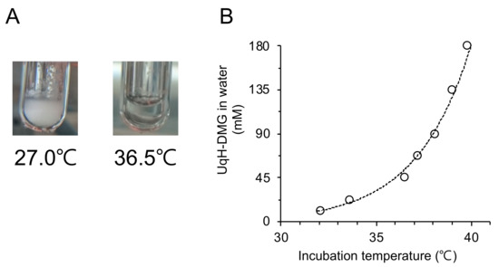 Influence of incubation temperatures on the solubility of UqH-DMG. (A) Representative photographs of 45 mM of UqH-DMG in water at 27.0 °C and 36.5 °C. (B) Solubilizing points of UqH-DMG in water versus incubation temperatures.