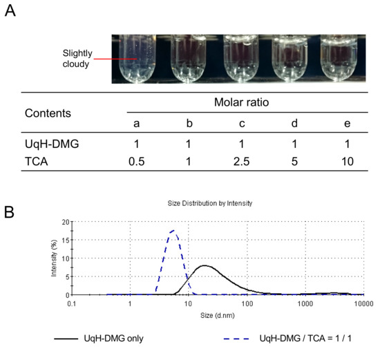 Effect of taurocholic acid on UqH-DMG solubility. (A) Appearance of mixtures of UqH-DMG and taurocholic acid (TCA) at different molar ratios. (B) Particle size distribution of UqH-DMG with or without TCA. Solid line: UqH-DMG only, dashed line: UqH-DMG:TCA at a molar ratio of 1:1.