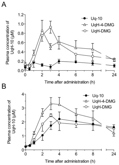 Plasma concentration of UqH-10 after administration of UqH-derivatives or Uq-10 in fasted and postprandial rats. (A) Plasma concentration of UqH-10 after administration of 40.5 mmol/kg weight of UqH-DMG, UqH-4-DMG or Uq-10 in fasted rats (UqH-DMG, n = 6; UqH-4-DMG, n = 5; Uq-10, n = 4); (B) plasma concentration of UqH-10 after administration of 40.5 mmol/kg weight of UqH-DMG, UqH-4-DMG or Uq-10 in postprandial state rats (n = 3). The values indicate mean ± SE.