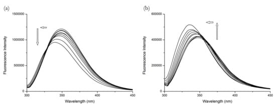 The fluorescence emission spectra of (a) BSA + R and (b) HSA + R systems at λEX = 295 nm. Conditions: T = 310.15 K, pH = 7.4. The human serum albumin (HSA) and bovine serum albumin (BSA) concentrations were 5 μM; R concentrations were 15.6, 31.25, 62.5, 125, 250, 500, 1000, 2000 and 4000 μM.
