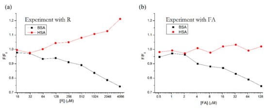 In Figure 3, we can see the similar behavior of these two compounds. Both R and FA cause the fluorescence of BSA to decrease, while the fluorescence of HSA either increases (R) or remains more or less constant (FA). Based on these results, we can assume that R also binds to the third binding site on subdomain IB.