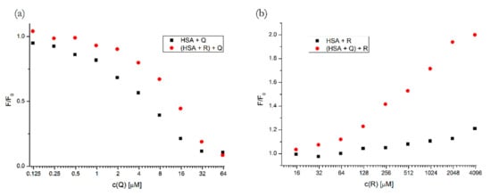In Figure 5, we can see that the presence of R slightly inhibited the binding of Q to HSA, since the quenching curve shifted towards higher concentrations.