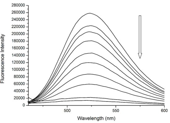 We can support this second assumption by analyzing the spectrum of Q + Trp fluorescent complex (Figure 6). This ground-state complex can be observed at λEX = 450 nm, with a maximum of λEM = 525 nm [14]. Upon the addition of R into the pre-incubated mixture of HSA + Q we can see that the band characteristic for bound Q is decreasing in intensity until it almost vanishes at the highest concentrations of R. One reason for this behavior is that the fluorescent complex was being disrupted and Q was being displaced from its binding site in Subdomain IIA—most likely due to allosteric modulation. Another possibility is that upon binding, R interacts with the Q + Trp fluorescent complex directly, causing the fluorescence quenching without any displacement of Q.