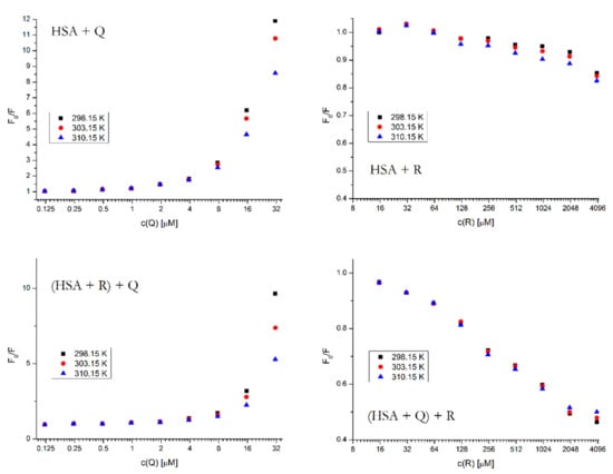 Stern–Volmer plots for all binary and ternary systems at different temperatures and λEX = 295 nm. The HSA concentration was 5 μM; the concentrations of Q and R were increasing from 0.12 to 62.5 μM and from 15.6 to 4000 μM, respectively. The concentrations of the firstly added drug in the ternary system was 5 μM for Q and 400 μM for R.
