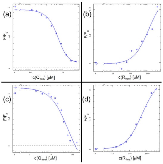 where F0 and F are the fluorescence intensities before and after a quencher addition, Kq is the Stern–Volmer quenching constant and [Q] is the quencher’s concentration [15]. The slope of the graph is therefore an indicator of the quencher’s behavior in the fluorophore’s proximity.