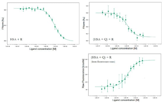The MST binding curves for all studied systems. Conditions: T = 297.05 K, pH = 7.4. The concentration of HSA was 20 nM, the starting concentrations of R were 7.15 mM, c(Q) in the ternary system was 20 nM.