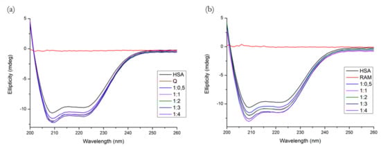 The far-UV CD spectrum of HSA showed two negative minima in the UV region at 208 nm and 222 nm, which is characteristic of the α-helical structure of HSA. The spectral profiles of the binary systems shown in Figure 10 indicate that the binding of both Q and R induced a minor perturbation in the HSA secondary structure.