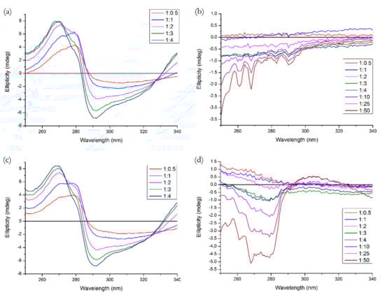 Near-UV CD spectra of (a) HSA + Q, (b) HSA + R, (c) (HSA + R) + Q, (d) (HSA + Q) + R. Conditions: T = 310.15 K, pH = 7.4. The HSA concentration was 15 μM, the ligand concentration ratios are listed in the legend.