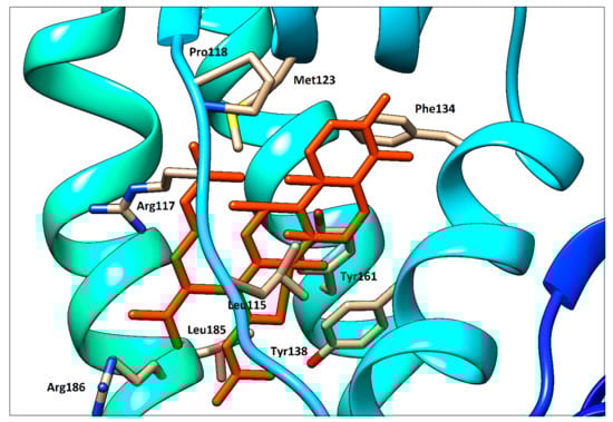 Detailed view of fusidic acid (orange red) docked with HSA.