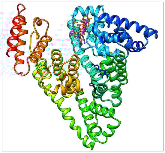 To support the interpretation of our spectroscopic results, quercetin, ramipril and fusidic acid were separately docked with HSA using PatchDock web service. As shown in our previous study [14], quercetin occupies binding site I (subdomain IIA, Figure 14). Fusidic acid occupies subdomain IB as previously demonstrated by X-ray diffraction with following amino acids in the ligand surroundings described: Leu115, Arg117, Pro118, Met123, Phe134, Tyr138, Ile142, Phe149, Leu154, Phe157, Tyr161, Phe165, Arg186 and Gly189 [6]. An analogous situation was observed in our fusidic acid docking result, which confirmed a sufficient accuracy of the docking procedure used (Figure 12). Thus, the docking result for ramipril—again within subdomain IB—seems to be verified (Figure 13). However, contrary to the findings of [6], we could not find any hydrogen bonds between HSA and ramipril using the docking service approach, which is less accurate than the X-ray method.