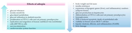 Studies on genetically engineered animals provided strong evidence indicating that adropin contributes to the modulation of adiposity and metabolism of glucolipids. It was found that adropin-overexpressing mice are protected from body weight gain when fed a high-fat diet for 6 or 8 weeks []. Of note, attenuation of body weight gain was accompanied by reduction of fat mass. On the other hand, the same study showed that adropin-overexpressing transgenic mice (Adr-Tg) challenged with a high-fat diet for 3 months had similar body weight as compared to wild type animals. These results suggest that adropin overexpression delays but not completely prevents diet-induced body weight gain. Moreover, it was found that Adr-Tg mice (male and female) fed a high-fat diet have lower fasting levels of insulin and triglyceride. In contrast, blood glucose levels were not affected by adropin. In addition, the same study showed that adropin overexpression is associated with reduced insulin resistance (the homeostatic model assessment of insulin resistance—HOMA-IR) and improved glucose tolerance []. Overall, these results provide strong evidence that adropin overproduction improves insulin sensitivity and glucolipid metabolism in obesity. This statement is supported by the results of studies in animals treated with exogenous adropin. Kumar et al. found that obese mice treated with adropin eat less and lose body weight. In addition, less striking hyperinsulinemia as well as attenuated hepatic steatosis are hallmarks in these mice []. Moreover, adropin-treated mice have low expression of lipogenic genes in the liver. This relationship was confirmed in animals treated with adropin for two weeks []. In addition to the beneficial metabolic effects in diet-induced obesity, adropin reduces blood glucose level, improves insulin sensitivity, and suppresses inflammatory markers in a rat model of type 2 diabetes []. Overall, these results collectively show that adropin is able to attenuate metabolic abnormalities in obesity as well as type 2 diabetes.