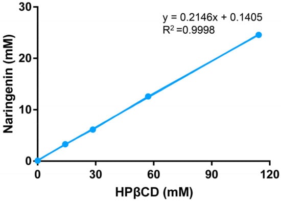 The phase solubility diagram of naringenin in the presence of HPβCD over a concentration range from 0 to 114.29 mM (mean ± SD, n = 3).