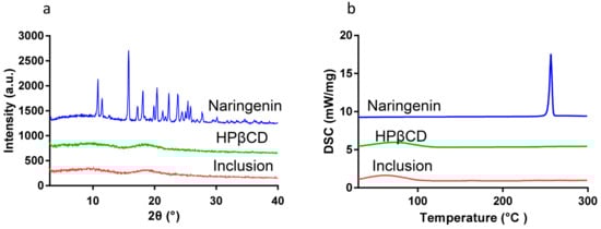 (a) XRD profile and (b) DSC thermogram of naringenin, HPβCD, and the inclusion.