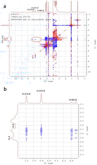 Two-dimensional rotating frame Overhauser effect spectroscopy (2D ROESY) spectrum of (a) naringenin-HPβCD inclusion and (b) partial expansion spectrum.