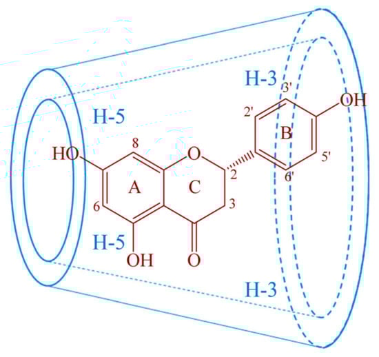 In order to further confirm the complexation mode of naringenin-HPβCD inclusion, 2D ROESY spectroscopy was utilized. It is able to reveal the spatial relationships between protons of guest and host molecules of cyclodextrin inclusions. Two protons that are closely located in a space can produce a nuclear Overhauser effect (NOE), presenting as a cross-peak between protons from two molecules in the 2D ROESY spectrum [28]. The ROESY spectra of naringenin-HPβCD inclusion (Figure 5) showed cross-peaks between H-6 and H-8, H-2′ or H-6′ and H-3′ or H-5′ protons of naringenin and H-3 and H-5 protons of HPβCD. Consistent with the observations of 1HNMR, the results of 2D ROESY indicated that the entire naringenin molecule was involved in the cavity of HPβCD. The possible inclusion mode of naringenin with HPβCD is illustrated in Figure 6.