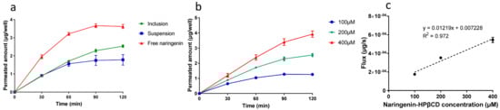 The transport mechanism of naringenin-HPβCD inclusion was also evaluated by the concentration-dependence study. As shown in Figure 7b, the permeated amount of naringenin was proportional to the inclusion concentration, which could be further demonstrated by the linear relation of the flux values of naringenin in this study (Figure 7c), suggesting that at least in the studied concentration range, the transport of naringenin-HPβCD inclusion was a diffusion-driven process without the participation of membrane transporters. Similar results were observed previously by complexing other drug with HPβCD [23].