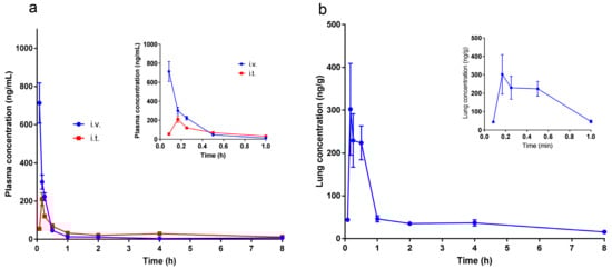 (a) Plasmatic pharmacokinetic profile of naringenin inclusion of i.v. and i.t. administration, inset was the magnification of the profile within 0.083~1 h; (b) pulmonary pharmacokinetic profile of naringenin inclusion of i.t. administration, inset was the magnification of the profile within 0.083~1 h (mean ± SEM, n = 6).