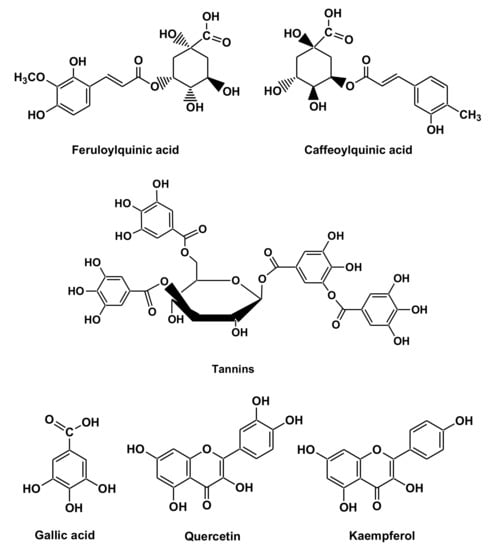 The protein content in the M. oleifera leaves extract was estimated to be 0.1% of the dry leaves powder. The total phenolic content in M. oleifera leaves extract was 23% of the dry leaves powder. An earlier study demonstrated that alanine, tyrosine, lysine, and threonine are among the major amino acids present in the M. oleifera leaves extract [34]. The concoction of M. oleifera leaves extract contains isomers of caffeoylquinic acid, isomers of feruloylquinic acid, tannins, gallic acid, and several flavonoids like quercetin, kaempferol and their glycoside derivatives [35]. The chemical structures of these compounds are shown in Figure 1. Collectively, these findings suggest that the M. oleifera leaves extract could serve as a nutritional supplement and a possible stabilizing agent for the formed copper nanoparticles.