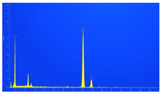 The completion of synthesis was characterized using a UV-3600 Plus UV-Vis double beam spectrophotometer (Shimadzu, Kyoto, Japan). The formation of copper nanoparticles and the role of biomolecules in this synthesis were confirmed using an ALPHA-E FTIR spectrometer (Bruker, Billerica, MA, USA). The crystalline nature of the synthesized copper nanoparticles was ascertained by XRD using a XRD-6000 diffractometer (Shimadzu, Kyoto, Japan). The size of the synthesized copper nanoparticles was measured by SEM using a FEI Quanta 200 scanning electron microscope, with the field emission gun (FEG) feature for better resolution (ThermoFisher Scientific, Waltham, MA, USA). The morphology assessment of the synthesized nanoparticles was performed by transmission electron microscopy (TEM) using a JEOL-TEM-2100 plus transmission electron microscopy (JEOL, Tokyo, Japan). The sample was dispersed in ethanol, coated on the grid, and dried for TEM analysis along with EDS analysis.