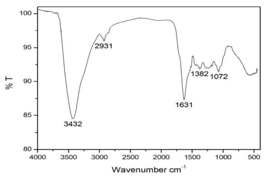 The FTIR spectra of the M. oleifera leaves extract and the synthesized copper nanoparticles are shown in Figure 6 and Figure 7, respectively. This vibration spectroscopy data can be used to understand the biomolecules involved in the synthesis of copper nanoparticles. The bands around 3400 cm−1 and 1630 cm−1 are broad in the M. oleifera leaves extract (Figure 6), corresponding to the vibration mode of a hydroxyl group, mostly found in polyphenolic molecules such as tannins, flavonoids, and glycoside derivatives. The signals at 1638 cm−1 and 1068 cm−1 correspond to N-H bending and C-N bond stretching, respectively.