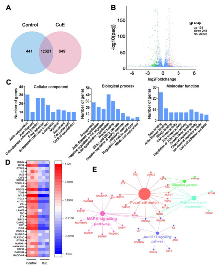 We profiled the effects of CuE on gene expression in Huh7 cells after 24 h treatment. The relationship of detected genes in the two groups was described in a Venn diagram (Figure 2A). A total of 365 DEGs showed significant alteration at p < 0.05 with a fold change > 2, of which 124 genes were markedly up-regulated while 241 genes were down-regulated. The volcano plot revealed the up-regulated and down-regulated genes in each dataset (Figure 2B). To elucidate the potential functions of these DEGs, we performed GO enrichment analysis, including cellular components (CCs), biological processes (BPs), and molecular functions (MFs). As shown in Figure 2C, for BPs, GO terms were significantly enriched in actin cytoskeleton, cell-substrate adherens junction, focal adhesion, and endoplasmic reticulum lumen. MFs analysis showed that the DEGs were particularly enriched in actin cytoskeleton organization, wounding healing, angiogenesis, MAPK, and cell cycle arrest. Similarly, GO terms enriched in actin binding, actin filament binding, and growth factor binding.