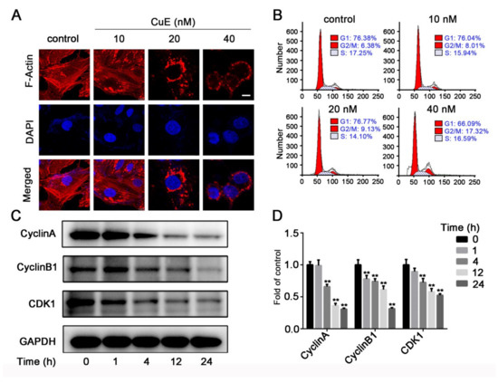 (A) CuE effected cytoskeletal organization. Huh7 cells grown coverslips were treated with CuE (0, 10, 20, and 40 nM) for 6 h. Immunocytochemistry was conducted using rhodamine-conjugated phalloidin to visualize F-actin fibers (bar = 10 μm). (B) Huh7 cells were treated with CuE (0, 10, 20, and 40 nM) for 24 h. The cells were fixed and stained with propidium iodide (PI), and the DNA content was analyzed by flow cytometry. (C) Huh7 cells were treated with CuE (40 nM) for different time points (0, 1, 4, 12, and 24 h), and the protein levels of cyclin A, cyclin B1 and CDK1 were detected by Western blotting. (D) Quantitative analysis for relative protein expression levels of CyclinA, CyclinB1, and CDK1 was performed by normalizing to GAPDH. Data are mean ± SD of three independent experiments (n = 3). **: p < 0.01.