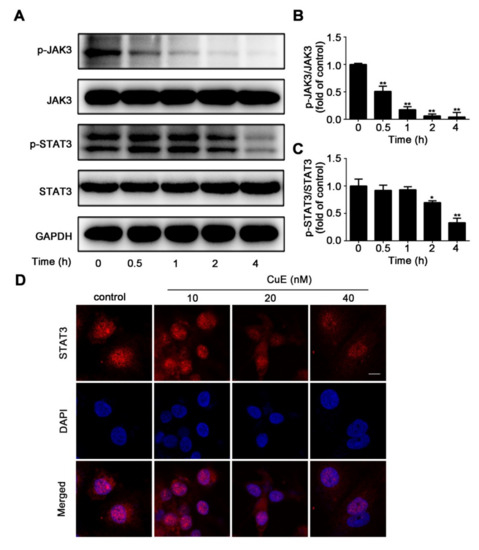 The JAK/STAT-mediated signaling cascade represents essential roles for proliferation or differentiation, and development. Recent studies showed that persistently activated JAK/STAT signaling correlates with tumorigenesis and cancer progression through its intimate connection to growth factor signaling and observed high frequency in human cancers. As shown in Figure 5A, CuE induced a time-dependent decrease in the level of p-JAK3 and p-STAT3. No detectable changes in the JAK3 and STAT3 were seen. Figure 5B,C also show densitometric analysis of Western blot bands. There was a gradual decrease in p-JAK3/JAK3 and p-STAT3/STAT3 ratios with increasing the concentration of CuE. Immunofluorescent analysis was also conducted to evaluate the effect of CuE on nuclear translocation of p-STAT3. As shown in Figure 5B, CuE attenuated the phosphorylation of STAT3. Consistently, CuE effectively blocked constitutive STAT3 phosphorylation as well as its nuclear translocation (Figure 5C,D). The decrease in cell viability can be attributable to the significant increase in apoptotic cell death and the occurrence of cell cycle arrest after inhibition of the JAK/STAT3 signaling pathway.