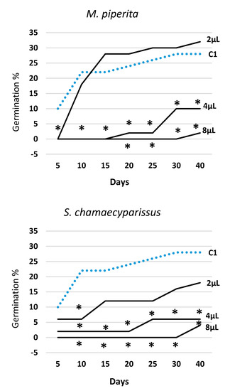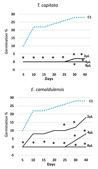 Figure 2 illustrates the trend over time of germination in all EOs and tested doses (2, 4, and 8 μL) along with the data obtained in the water control (C1). The effectiveness of all EOs varied with the tested dose, always following the rank 2 μL < 4 μL < 8 μL. T. capitata EO was effective from the very start of the experiment, and in all survey dates, all three doses were statistically different from the water control (C1). The EOs of E. camaldulensis and S. chamaecyparissus showed a rather similar effectiveness over time and, when administrated at the lowest dose (2 μL), they—with the exception of few observations—did not behave differently from the water control (C1). Otherwise, the two highest doses (4 μL and 8 μL) allowed a significant reduction of seeds germination in all survey dates. The EO of M. piperita expressed a significant effectiveness at the two highest doses as well, but at the lowest dose (2 μL), starting from the third survey date (15 days), it showed even higher germination values than the water control (C1).