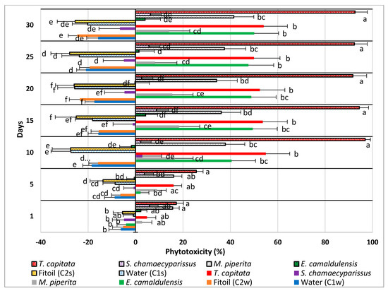 The EO of T. capitata was the most effective in both administration ways; when sprayed, it reached very quickly (10 days after treatment) a phytotoxicity level close to 100%. When applied by watering, it still kept a phytotoxicity level higher than all other EOs, but the statistical test demonstrates that its efficacy was, on average, similar to that expressed by the EOs of E. camaldulensis (watered) and M. piperita (sprayed).