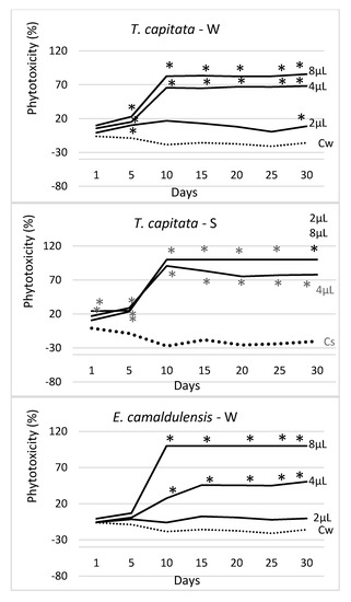 Figure 4 shows the trend over time of the measured phytotoxicity level in each EO, application method, and tested dosage (2 μL, 4 μL, and 8 μL), along with the data obtained in the respective water controls (Cw—watered and Cs—sprayed). In all cases, a strong dose–effect occurred, and the calculated phytotoxicity was growing with the applied dose (2 μL < 4 μL < 8 μL). The EO of T. capitata was the most effective of all, especially when sprayed. In this case, at the higher doses (4 μL and 8 μL), it started showing its effectiveness from the very beginning of the experiment (day 1), allowing an effectiveness close to 100% since the 10th day of observation. At the lowest dose (2 μL), this EO proved a higher effectiveness when sprayed. When applied by watering, the phytotoxic effect of T. capitata was lower, although, in the last survey, it was, however, significantly different from the control. The E. camaldulensis EO was the only one showing a higher effectiveness when administered by watering; at the highest dose (8 μL) it showed complete effectiveness (100% phytotoxicity) since the 10th day of observation, showing no statistical difference with the 8 μL treatment. When sprayed, the E. camaldulensis EO showed a lower phytotoxicity level (about 38% at the highest dose), although statistically well differentiated from the water control at the end of the experiment (day 30). The S. chamaecyparissus EO was the less effective of all; on day 30 and at 8 μL, it reached a phytotoxicity level of about 30% (with watering distribution) and 21% (after spraying).