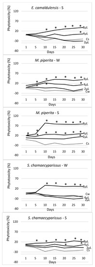 Trend over time of the phytotoxicity level (%) of 4 EOs at three doses (2 μL, 4 μL, 8 μL), distributed by watering (W) and spraying (S) on seedlings of Erigeron bonariensis. For each observation day, values marked with * are significantly different from the respective water controls (Cw and Cs; dotted lines) (Dunnett’s test, P ≤ 0.05).