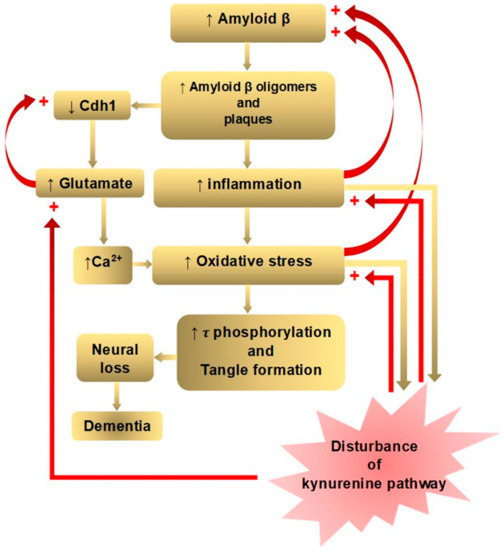 Positive feedback loops of amyloid β hypothesis of Alzheimer’s disease in connection with disturbance of the kynurenine pathway. The amyloid beta (Aβ) cascade, inflammation, tau phosphorylation, and neuroplasticity hypotheses lie in one downward cascade, and the glutamate and calcium hypotheses lie in another branched downward cascade of pathological events leading to dementia. Positive feedback loops are located between inflammation and increased Aβ accumulation, between increased oxidative stress and increased Aβ accumulation, and increased glutamate and decreased cadherin 1 CDh1). Kynurenine (KYN) pathway enzymes are activated by inflammation: the tryptophan dioxygenase (TDO) by the glucocorticoid stress hormone, cortisol and indolamine-2,3-dioxygenase (IDO1) by pro-inflammatory cytokines, interferon (IFN)-α, interleukin (IL)-1β, IFN-γ, and tumor necrosis factor (TNF)-α. IFN-γ also activates formamidase and kynurenine-3-monooxygenase (KMO) in human microglia and macrophages. KYN pathway metabolites, 3-hydroxykynurenine (3-HK) and quinolinic acid (QUIN) are highly reactive free radicals. In addition, QUIN is an N-methyl-d-aspartate receptor (NMDAR) agonist, causing excitotoxicity. Thus, disturbance of the KYN pathway potentiates inflammation, oxidative free radical attack, and excitotoxic glutamate production (partly adopted from Doig, 2018).