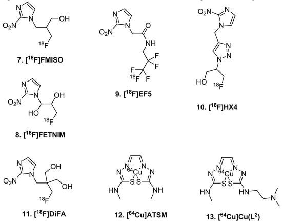 - Wack, L.J.; Moennich, D.; van Elmpt, W.; Zegers, C.M.L.; Troost, E.G.C.; Zips, D.; Thorwarth, D. Comparison of [18F]-FMISO, [18F]-FAZA and [18F]-HX4 for PET imaging of hypoxia - a simulation study. Acta Oncol. 2015, 54, 1370–1377. [Google Scholar] [CrossRef] [PubMed]