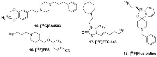 - Lee Collier, T.; O’Brien, J.C.; Waterhouse, R.N. Synthesis of [18F]-1-(3-Fluoropropyl)-4-(4-cyanophenoxymethyl)-piperidine: A potential sigma-1 receptor radioligand for PET. J. Label. Compd. Radiopharm. 1996, 38, 785–794. [Google Scholar] [CrossRef]