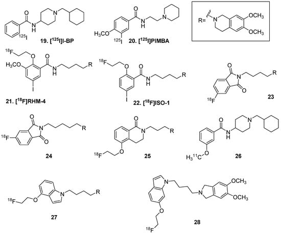 - Wang, L.; Ye, J.; He, Y.; Deuther-Conrad, W.; Zhang, J.; Zhang, X.; Cui, M.; Steinbach, J.; Huang, Y.; Brust, P.; et al. 18F-Labeled indole-based analogs as highly selective radioligands for imaging sigma-2 receptors in the brain. Bioorg. Med. Chem. 2017, 25, 3792–3802. [Google Scholar] [CrossRef]