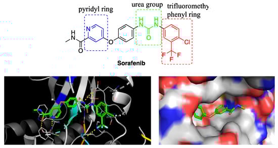 The structure of sorafenib (top) and the binding mode (bottom, left) and binding cavity (bottom, right) of sorafenib and B-RAF kinase.