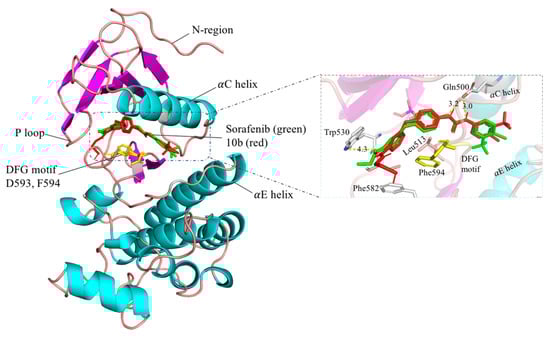 Predicted binding mode of sorafenib and compound 10b (affinity: −11.2 kcal/mol) in B-RAF kinase. Sorafenib is in green and compound 10b in red.