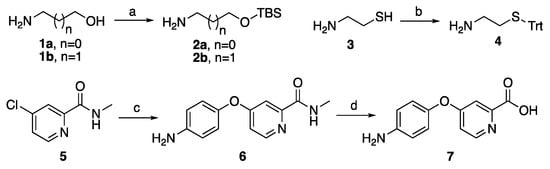 Ethanolamine, 3-aminopropan-1-ol and 2-mercaptoethylamine as side chains were introduced into sorafenib. Meanwhile, as Scheme 1 described, tertbutyldimethylsilane chloride (TBSCl) and triphenylmethanol firstly reacted with OH or SH to get 2a–b and 4 for avoiding the by-products caused by OH or SH group over-reaction. Moreover, the key intermediate 7 was synthesized from starting material N-methyl-4-chloropyridine-2-carboxamide (5), which reacted with 4-aminophenol to form compound 6 in the presence of potassium tert-butoxide and K2CO3, following demethylated in 2.5 mol/L KOH in 81% overall yield.