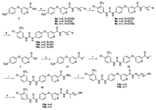Synthetic routes of target compounds 10a–c and 15a–b. Reagents and conditions: (e) 2a–b or 4, HOBt, EDC.HCl, DIEA, DCM, rt, 10 h, 86–88%; (f) 4-chloro-3-trifluoromethylphenyl isocyanate, DCM, rt, 2 h, 85–93%; (g) I: TBAF, THF, rt, 1 h, 95%; II: TIS, TFA, DCM, rt, 84%. (h) MeOH, SOCl2, reflux, 8 h, 86%; (i) NH2NH2.H2O, EtOH, rt, 15 h, 95%; (j) Hydroxyacetone or 4-hydroxy-2-butanone, HAc, EtOH, reflux, 8 h, 75% and (k) NaBH3CN, HAc, MeOH, rt, 8 h, 87%.