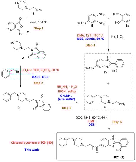 The role played by Zn and Cu cations in the Aβ deposition and stabilization has been a matter of debate in the literature in the last decade as well as the possibility that metal chelating agents can lead to the dissolution of Aβ and/or aggregation by preventing the interaction between the metal and the protein [2,11,17,21,65,66,67,68,69]. According to the metal hypothesis of AD, it is important the inclusion of chelating moieties in the design of therapeutic/diagnostic agents [69]. Our groups recently focused on the synthesis and the biological evaluation of new Donepezil-like conjugates, and especially interesting were the results obtained from biological assays on PZ1 [19,20,21]. The synthesis of this new hit compound was designed using VOCs ([19], Figure 1, red). Particularly disappointing from an environmental viewpoint were Steps 2, 4 and 5 in which it was made use of toxic and anhydrous CH3CN (step 2), N,N-dimethylacetamide (DMA) (Step 4), N,N-dimethylformamide (DMF) (Step 5), and of a carcinogenic reactant like hydrazine hydrate in Step 3. In addition, Step 4 also required up to 12 h reaction time for completion. Thus, we decided to reshape the whole synthesis of PZ1 using DESs as environmentally responsible reaction media (Figure 1, blue).